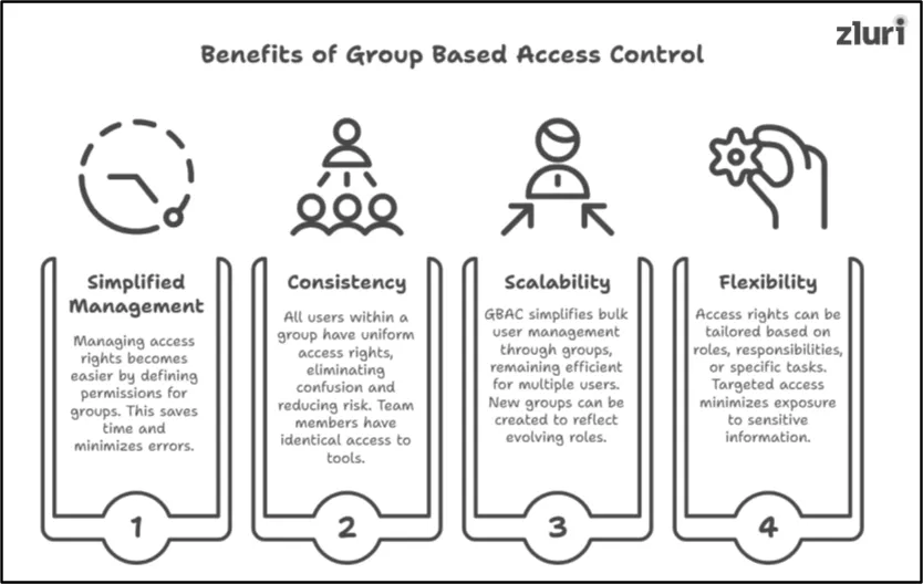 Instead of configuring individual permissions, group based access control allows access to be managed at the group level, which reduces administrative workload, minimizes human error, and ensures the right people have the right access.