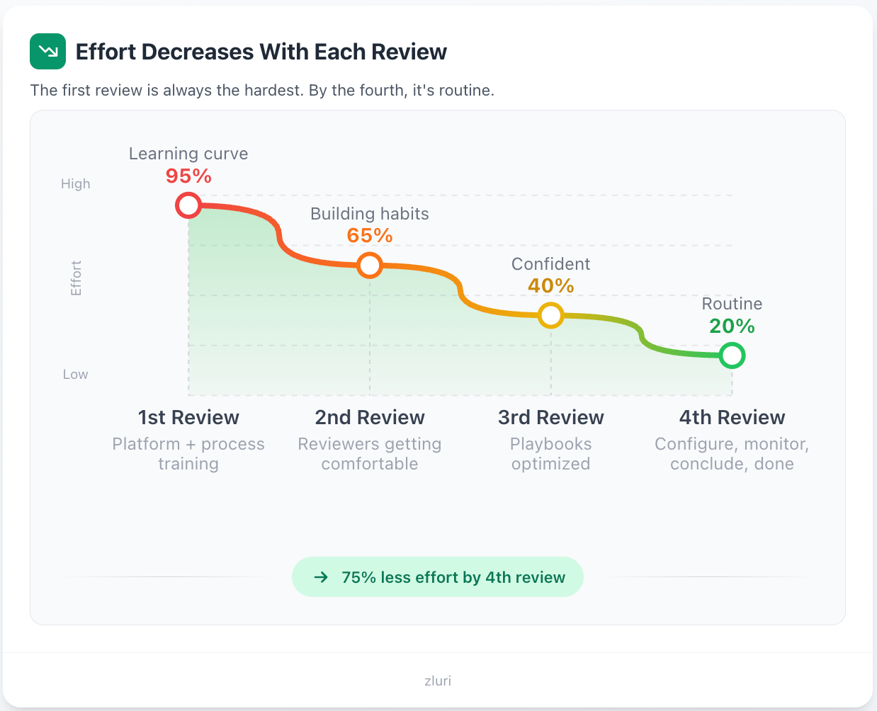 Tool implementation: Modern IGA tools like Zluri can be implemented in 1-2 weeks (technical setup, integrations, initial configuration). Traditional/legacy IGA tools take 6-12 months just for implementation before you can even start using them properly.