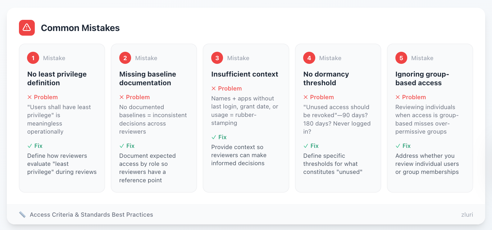 Mistake 3: Ignoring regulatory drivers Not mapping to specific compliance requirements (SOC 2 CC6.2, ISO 27001 A.9.2.5, SOX ITGC) makes it harder to prove you're meeting standards.