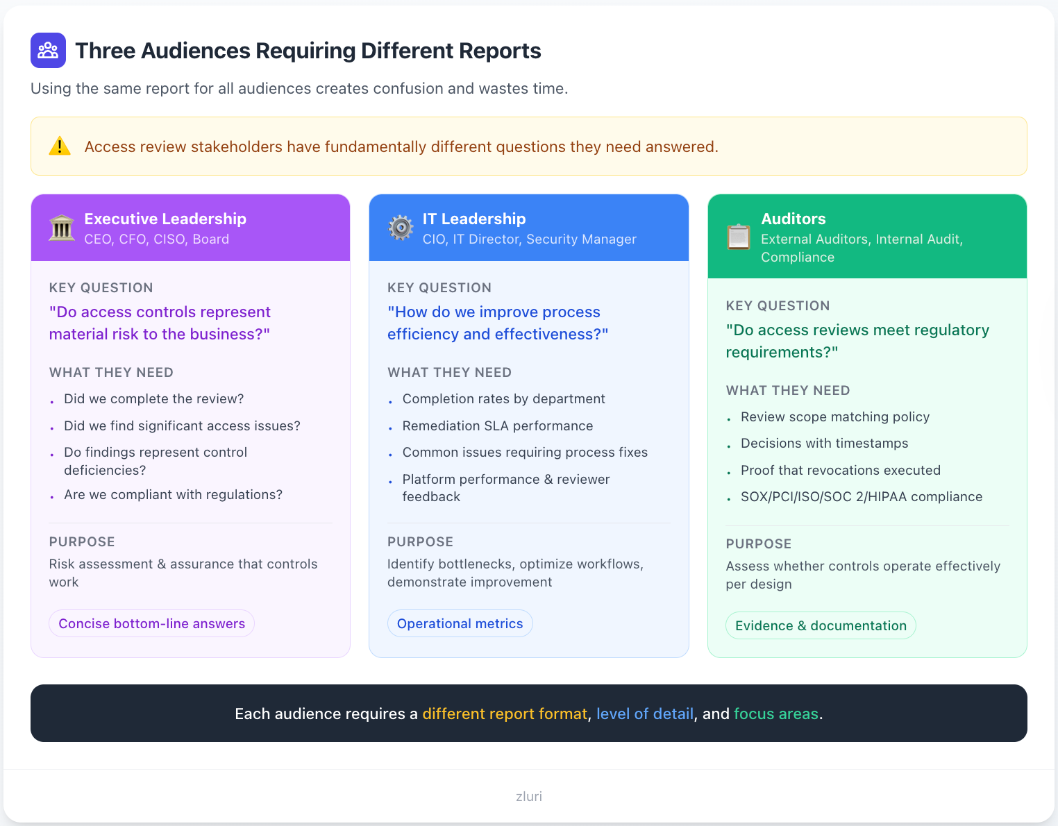 One access review. Three stakeholders. Three completely different needs. One useless report that satisfies no one.