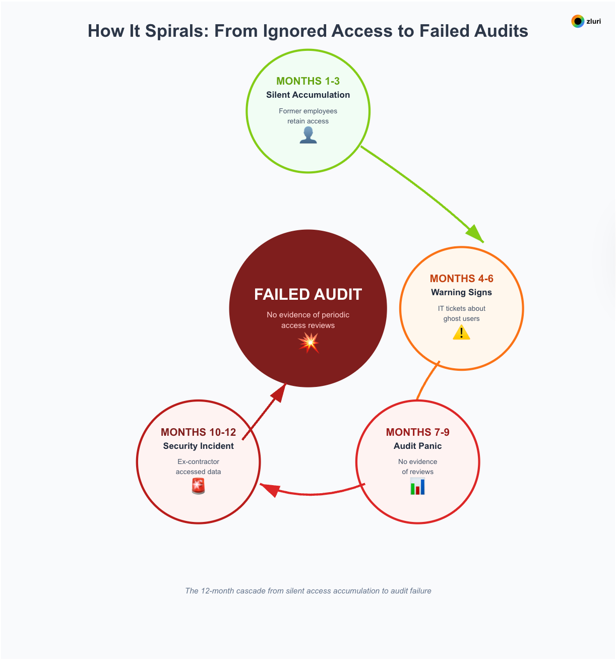 Months 10-12: Security incident: Former contractor accessed sensitive customer data 6 months after their project ended. Incident investigation reveals the access was never revoked—no systematic review would have caught it.