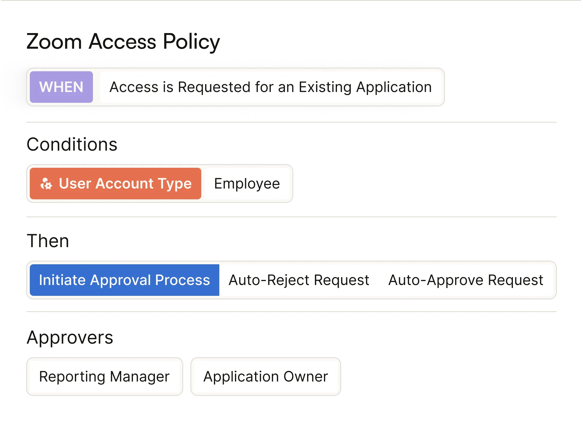 Admins can create no-code, customizable policies with multi-step approvals for critical apps. Set rules to auto-approve or reject requests based on risk levels and user roles, simplifying compliance.